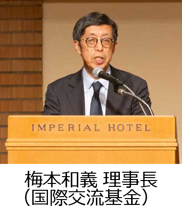 最初に、主催者を代表して国際交流基金の梅本和義 理事長が挨拶を行い、基金が創設50周年であり、その長きにわたってヴォーゲル先生が日米関係構築に貢献されてきたことを紹介し、そしてドキュメンタリービデオ「Bridge Builder エズラ・F・ヴォーゲルの生涯」を作成中であるとの報告がありました。
